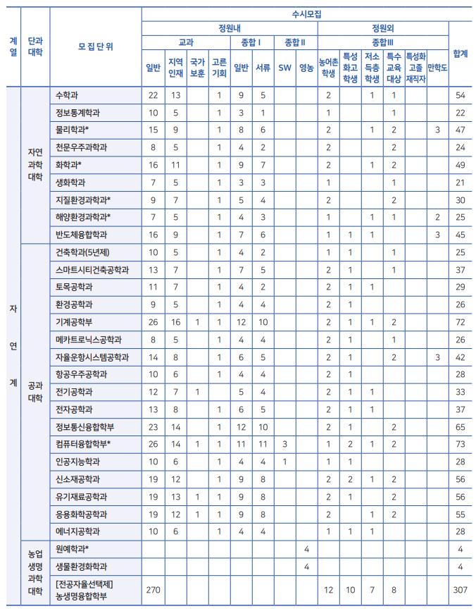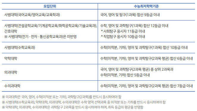 ※ 자연과학대학(수학과, 정보통계학과), 사범대학(수학교육과), 약학대학, 의과대학, 수의과대학은 수학 영역 선택과목 중 미적분 또는 기하를 반드시 응시하여야 함
