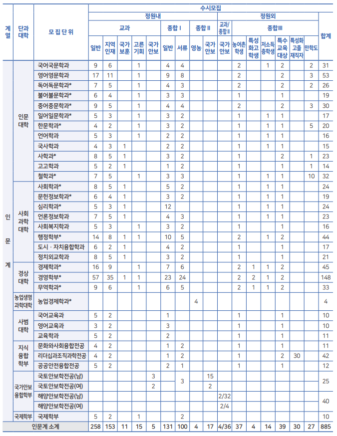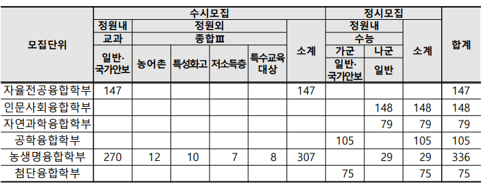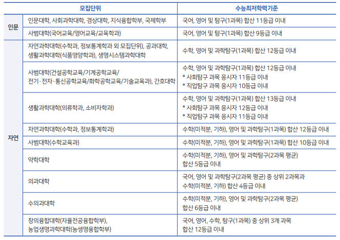 ※ 창의융합대학(자율전공융합학부), 농업생명과학대학(농생명융합학부)은 국어, 영어, 수학, 탐구(1과목)를 반드시 응시하여야 하며, 의과대학은 국어, 영어, 수학(미적분 또는 기하), 과학탐구(2과목)를 반드시 응시하여야 함
