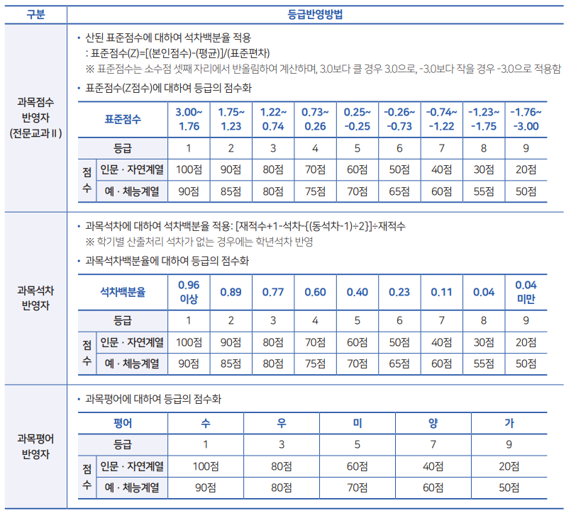 나) 평어만 있는 경우 평어를 과목석차등급으로 변환 다) 특성화고교 전문교과Ⅱ(A~E로 표시하는 절대평가 과목의 경우) 이수자는 과목점수[원점수/과목평균(표준편차)]를 활용하여 과목석차등급으로 변환 라) 소인수 수강과목 등 과목석차등급이 없는 교과목[등급이 (·)로 표기된 경우 포함]은 미반영