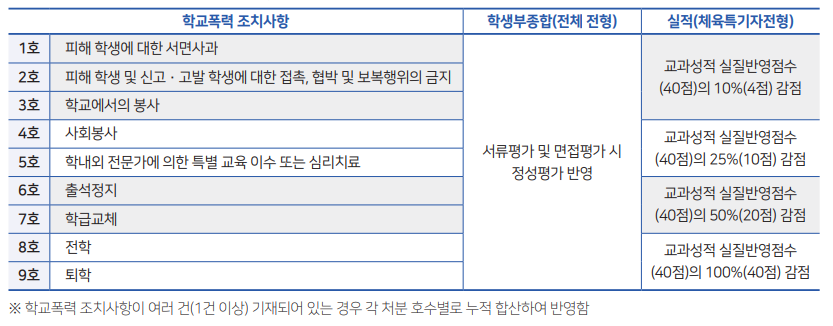 ※ 「학교폭력예방 및 대책에 관한 법률」 제17조제1항에 의거하여 학교생활기록부에 기재된 학교폭력 조치사항을 반영함