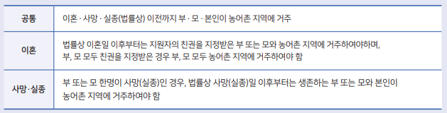 • 고등학교(초·중 포함) 재학 또는 졸업 이후 행정구역 개편 등으로 읍·면 지역이 동 지역으로 변경된 경우에는 지원이 가능함 (반대의 경우는 인정하지 않음)