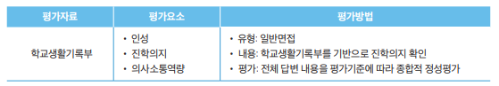 (1) 서류평가 : 학교생활기록부 전 영역을 평가기준에 따라 종합적 정성평가