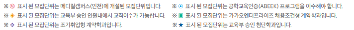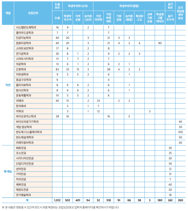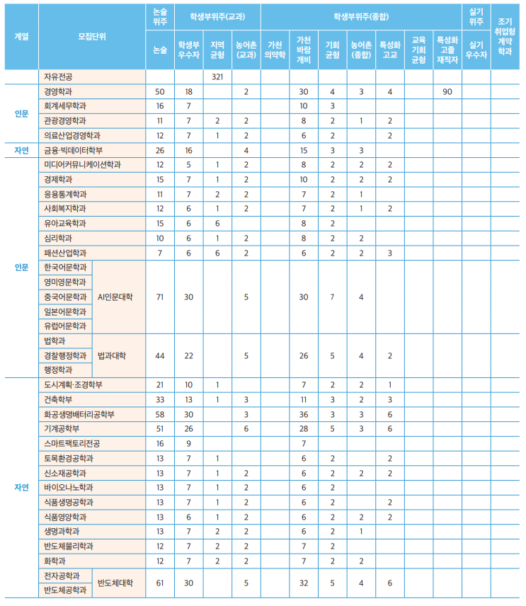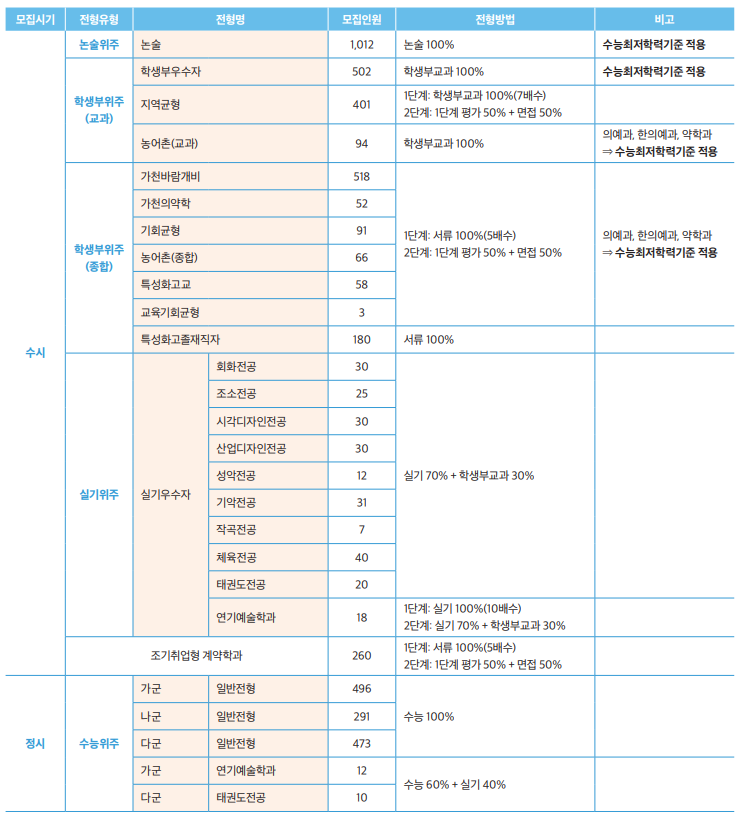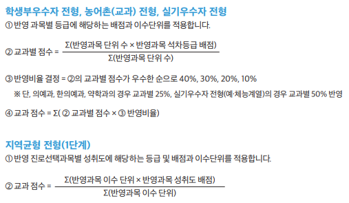 - 학생부우수자, 농어촌(교과), 실기우수자: 반영 필수교과별 최소 1개 이상의 과목 반드시 이수 (석차등급 기재).