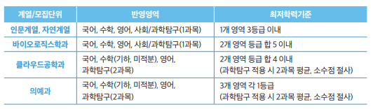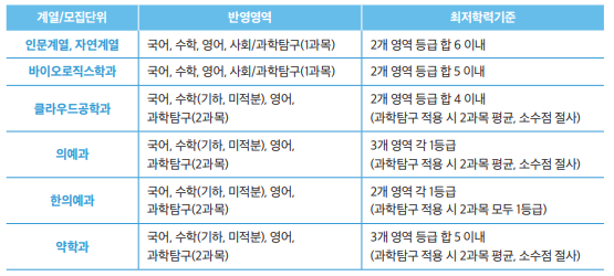 학생부우수자 전형 자연계열 국어, 수학, 영어, 사회/과학탐구(1과목) 중 2개 영역 등급 합 6 이내 [단, 수학(기하, 미적분)을 반영할 경우 1개 등급 상향하여 적용] |