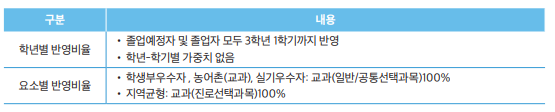 - 교과의 반영은 ‘국어’,‘수학’,‘영어’,‘사회’ 또는 ‘과학’만 반영하며 기타 교과는 반영되지 않을 수 있습니다.