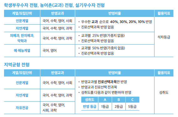 - 지역균형: 반영대상 전체 교과 중 1개 이상 과목 이수 (성취도 기재)