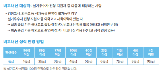 - 국내 고교 졸업(예정): 모집전형별 기준에 따른 교과 성적 반영(국내 고등학교 교과성적 외 기타 성적은 반영하지 않음)