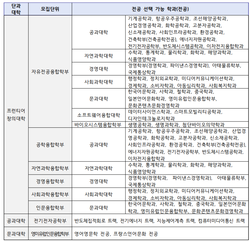※ 프런티어창의대학 자유전공융합학부, 단과대학별 융합학부(공학융합학부, 자연과학융합학부, 경영융합학부, 사회과학융합학부, 인문융합학부)는 모집단위광역화 과정에서 2025학년도에 신설된 학부임. 자유전공융합학부 입학생은 아래 제시된 학과(전공)** 외 모든 학과(전공)의 선택이 가능하며, 단과대학별 융합학부 입학생은 관련 단과대학 내 학과(전공) 선택이 가능함.