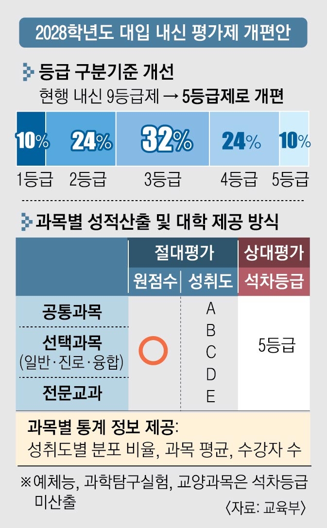 (2) 선택과목이 절대평가 방식으로 전환된다. 다만 원점수와 과목평균, 성취도, 수강자 수, 성취도별 학생 비율 등 수업 정보를 기록하도록 했다. 대학들이 학생들이 받은 등급의 가치를 가늠할 수 있도록 하겠다는 취지이다. 예를 들어 50명 수강 인원 중 4%가 A등급인 수업에서 A등급을 받은 경우와 A등급이 50%인 수업에서 받은 A등급의 가치는 다를 수 있다. 고교 교사나 강사들이 A등급을 남발하지 못하게 하는 ‘성적 부풀리기’ 예방 장치를 둔 것이다.